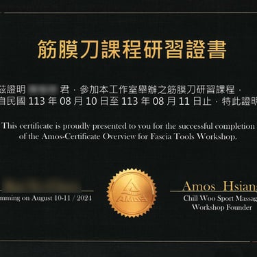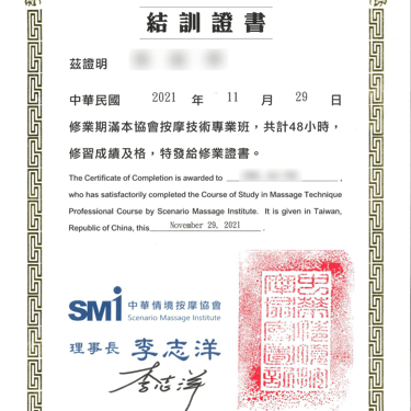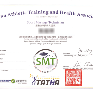 證照/認證:中華情境按摩協會 - 技術專業班證書、Sport Massage Technician 運動按摩技術員證照、筋膜刀課程研習證書。